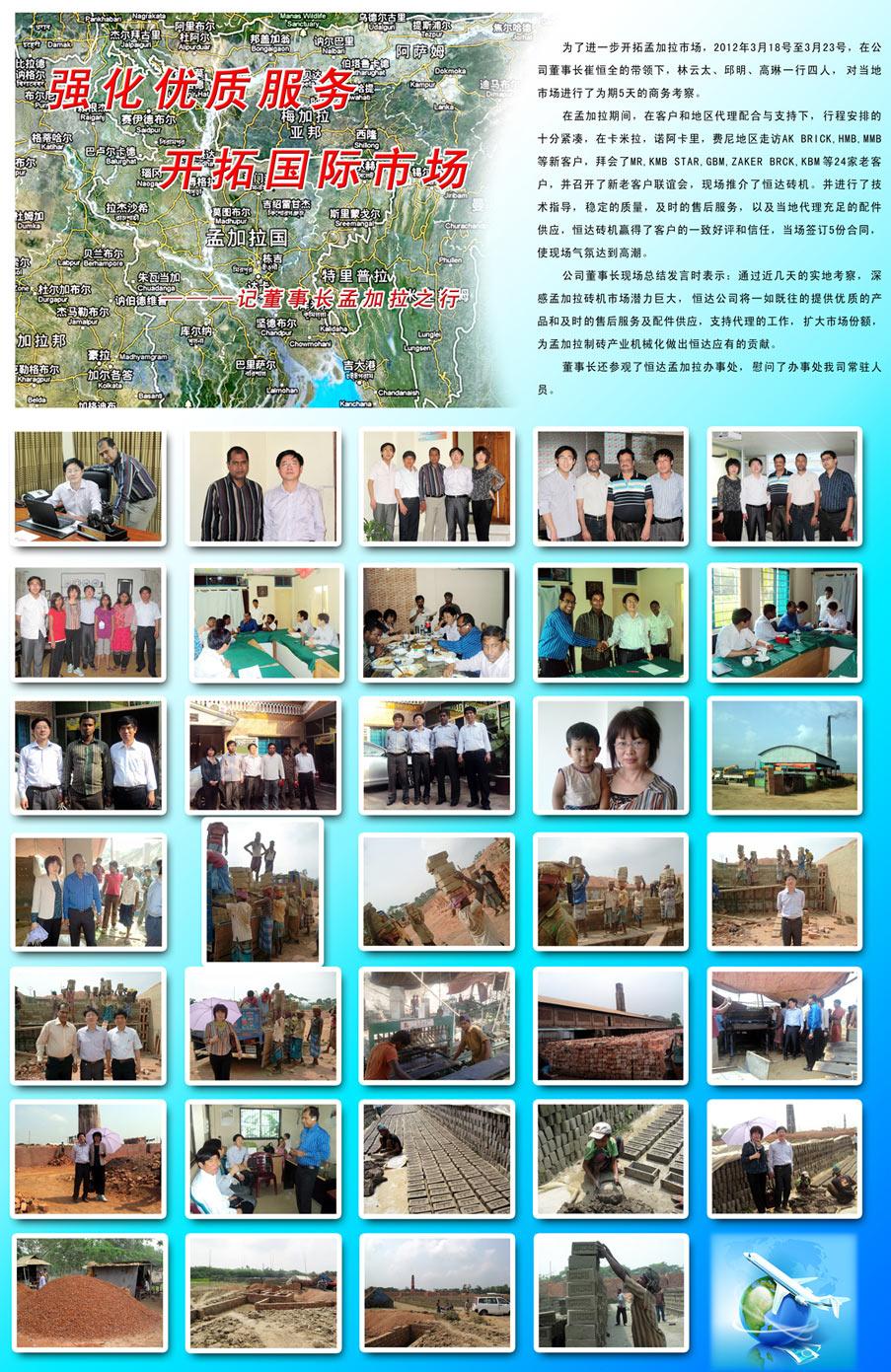 在孟加拉期間,公司得到了當(dāng)?shù)卮砩痰亩αχС郑匍_(kāi)了新老客戶聯(lián)誼會(huì),對(duì)當(dāng)?shù)厥袌?chǎng)的磚瓦行情進(jìn)行深入交流。當(dāng)前孟加拉多半還是手工制磚,而且國(guó)家已經(jīng)出臺(tái)了政策,截至2015年取消手工做磚。這對(duì)于公司來(lái)說(shuō)是個(gè)很大的機(jī)遇。但同時(shí),競(jìng)爭(zhēng)也是激烈的,各個(gè)磚機(jī)廠紛紛涌入孟加拉市場(chǎng),加強(qiáng)對(duì)當(dāng)?shù)厥袌?chǎng)的開(kāi)發(fā),可以說(shuō)機(jī)遇與挑戰(zhàn)并存的,這就要求公司要嚴(yán)抓產(chǎn)品質(zhì)量,加強(qiáng)售后服務(wù),爭(zhēng)取使我們的機(jī)器遍布孟加拉市場(chǎng)。